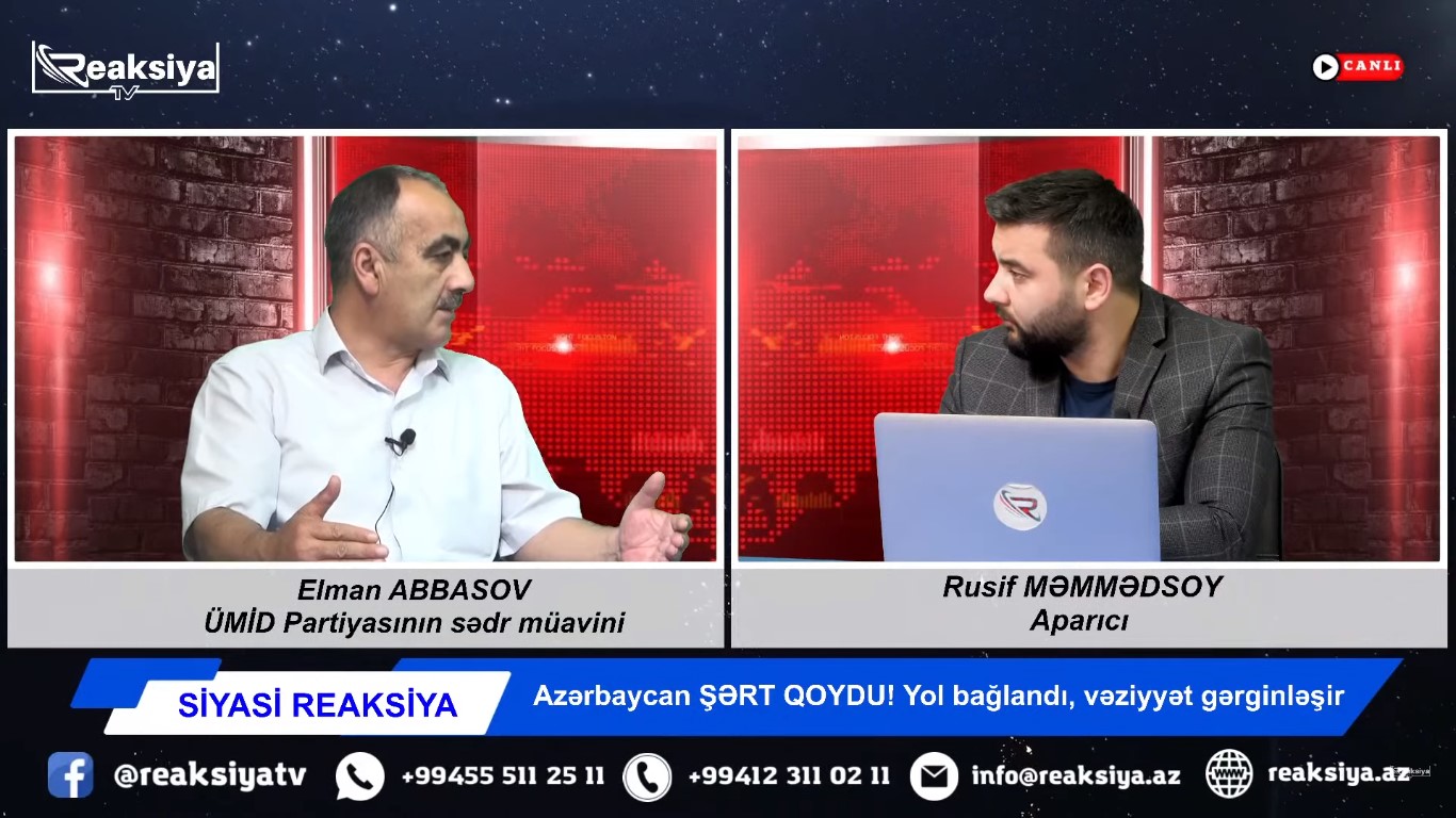 Azərbaycan Ümid Partiyası / Azerbaijan Umid Party – nın diaspor, xaricdə yaşayan soydaşlar və ictimaiyyətlə əlaqələr üzrə sədr müavini Elman Abbasov 16 iyun 2023-cü il Reaksiya Tv-də Rusif Məmmədsoyun təqdimatında canlı efir qonağı olub.