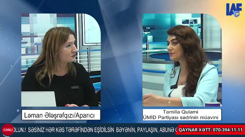 Azərbaycan Ümid Partiyasının İdarə Heyətinin üzvü Tamilla Qulami LAF TV kanalında Leman Eleşrefqızının təqdimatında 4 aprel 2025-ci il canlı efir qonağı olub.