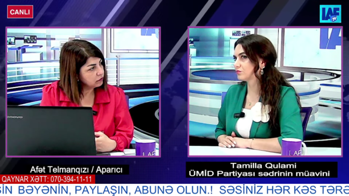 Millət vəkili iradını şəxsi zəmində bildirməsin, seçicinin mənafeyi üçün səsləndirsin – TAMİLLA QULAMİ 18 İyun 2024 Azərbaycan Ümid Partiyası / Azerbaijan Umid Party– nın İdarə Heyətinin üzvü Tamilla Qulami LAF TV kanalında Afət Telmanqızının təqdimatında 18 iyun 2024-cü il canlı efir qonağı olub. Sözügedən efiri izləyicilərə təqdim edirik: https://www.youtube.com/watch?v=l5BnTP7goUY&t=1085s Şərh yaz