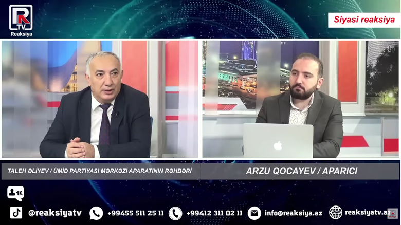 Azərbaycan Ümid Partiyası Mərkəzi Aparatının rəhbəri Taleh Əliyev Reaksiya TV kanalında Arzu Qocayevin təqdimatında 15 dekabr 2025-ci il canlı efir qonağı olub.