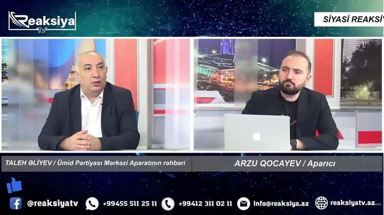 Azərbaycan Ümid Partiyası Mərkəzi Aparatının rəhbəri Taleh Əliyev Reaksiya TV kanalında Arzu Qocayevin təqdimatında 10 noyabr 2025-ci il canlı efir qonağı olub.