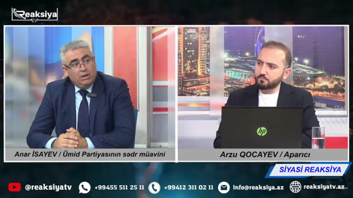 Azərbaycan Ümid Partiyası / Azerbaijan Umid Party -nın İdarə Heyətinin üzvü Anar İsayev Reaksiya TV kanalında Arzu Gojayevin təqdimatında 13 iyun 2024-cü il canlı efir qonağı olub.