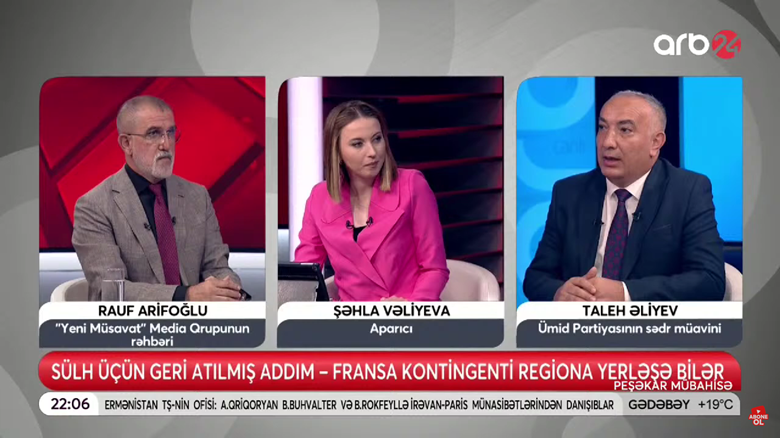 Azərbaycan Ümid Partiyasının Mərkəzi Aparatının rəhbəri Taleh Əliyev Arb 24 kanalında “Peşəkar mübahisə” verilişində 19 iyun 2024-cü il Şəhla Vəliyevanın təqdimatında canlı DEBAT qonağı olub.